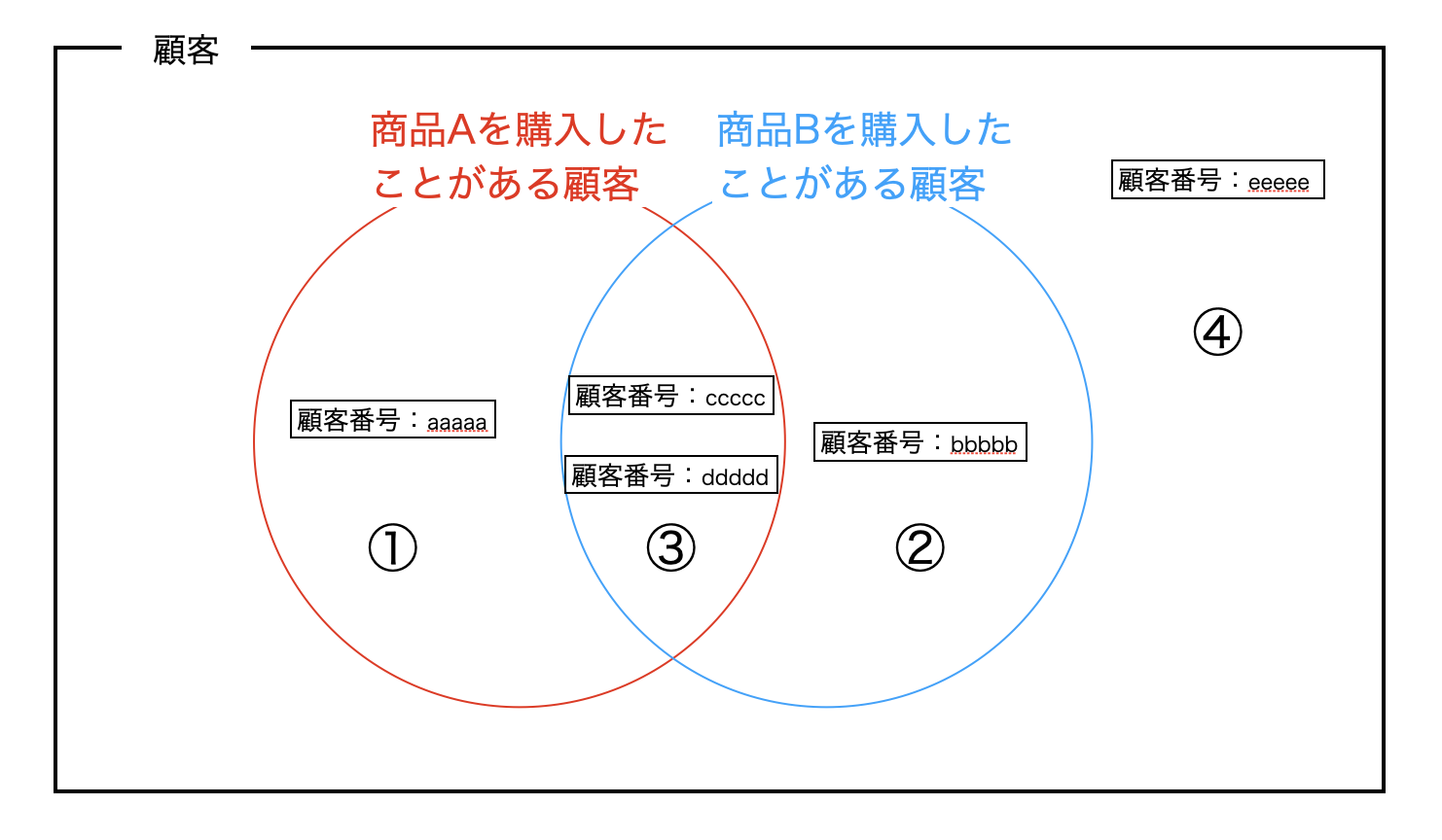 | 「顧客番号:ddddd」 | 商品Aと商品Bを同時に含む受注を持っている。 |