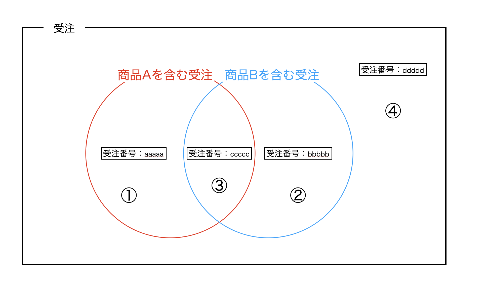 | 「受注番号:ddddd」 | 商品Aと商品Bのどちらとも含まない受注。 |