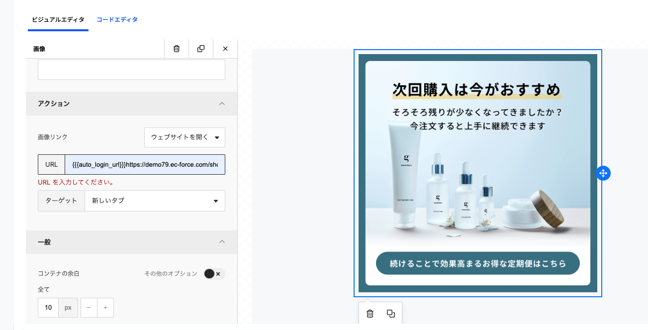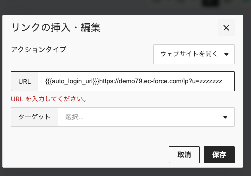 自動ログイン変数を利用する場合は、URLの先頭に自動ログイン用の変数(例:{{{auto_login}}})を含めた状態でアクション先に設定します。